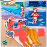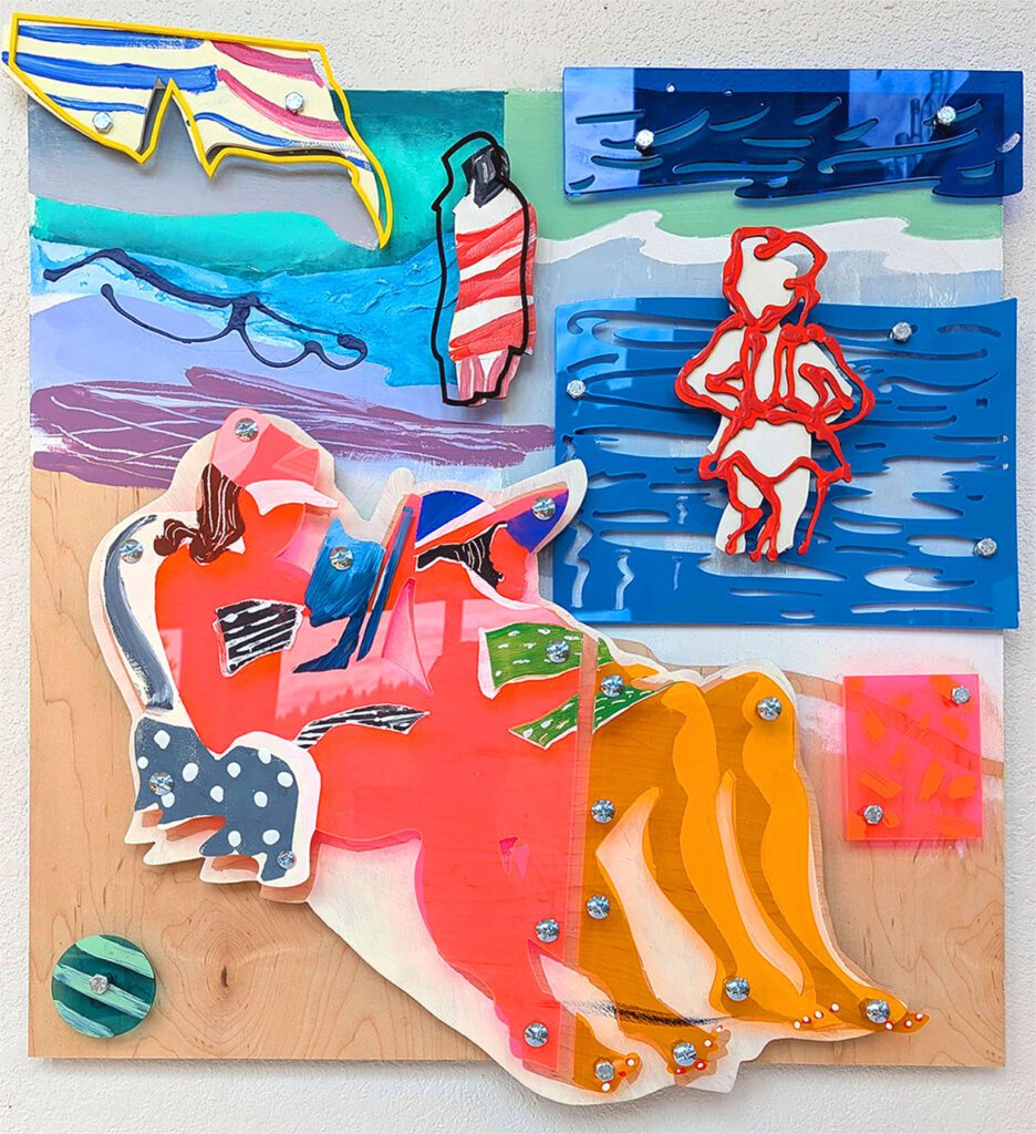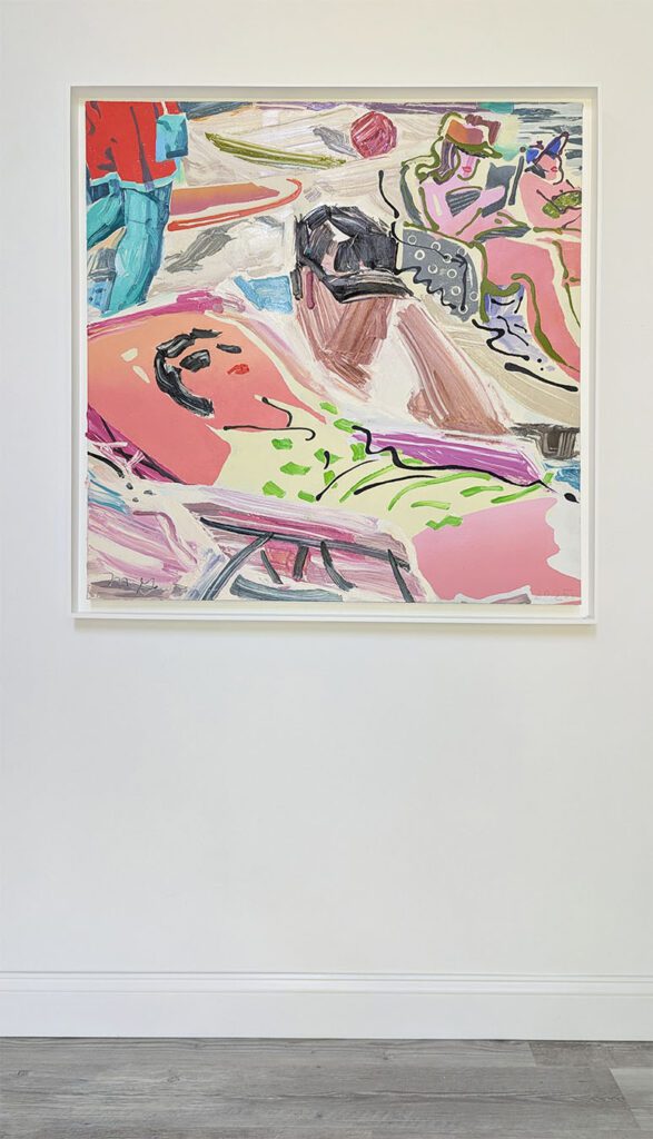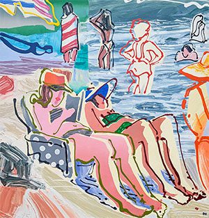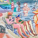 Nuance and texture in Margery’s beach series activate sensations of being by the shore. Saturated colors, beach umbrella diagonals, and shapes off-set from outlines register states of motion.